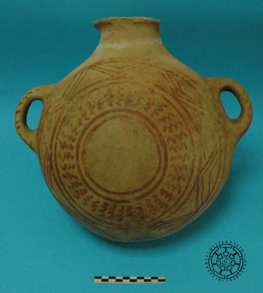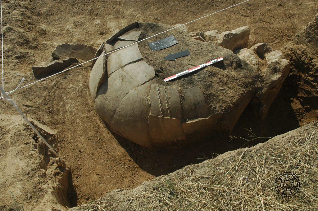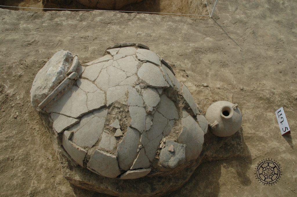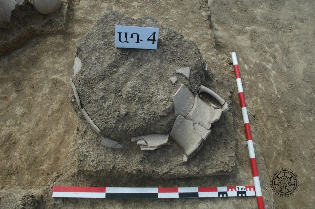 Չորրորդ թաղումը հայտնաբերվել է տարածքի արտաքին մակերեսից 0,30 մետր խորության մեջ, ոչ մեծ անոթում, տեղակայված հարավ-արևմուտքից հյուսիս-արևելք (նկ. 5): Ննջեցյալը տեղադրված էր գլխով դեպի անոթի հատակը։ Մյուս ոսկրային մնացորդները շատ վատ էին պահպանված: Կարասը անմխիթար վիճակում էր՝ շատ մակերեսային թաղված լինելու և մեր օրերում ծանր տեխնիկայի գործունեության հետևանքով: Այն պատրաստված է բաց դեղնավուն վատ թրծված, փխրուն խեցուց: Աղակալված առանձին բեկորների վրա հազիվ նշմարվում էին նկարազարդման հետքեր: Անոթի ներսում, ոսկորների բեկորների հետ խառնված, հայտնաբերվեցին սարդիոնե 13 ուլունք և օղի տեսքով երկու փոքրիկ ականջօղ: Կարասը մաքրելուց և վերականգնելուց հետո (չափերը՝ 0,80×0,60 մետր) պարզ դարձավ, որ այն երկու մեծ բռնակներով, լայն բերանով և տափակ դուրս ձգված շուրթով, ամֆորանման անոթ է (նկ. 6): Բռնակների և շուրթի մակերեսները ներկված են կարմիր գույնով, վզի և իրանի սկզբնամասի միացումը ընդգծված է երկու կարմիր գծերով և մատնասեղմումով զարդարված ուռուցիկ գոտիով: Անոթի իրանը վերևից մինչև միջնամասը նկարազարդված է նույնատիպ երկու կարմիր գոտիներով, որոնցից վերինում պատկերված է՝ «եղնիկի որսի» տեսարան: Տեսարանը ծավալվում է լայնասաղարթ ծառի շուրջը: Նիզակներով և նետ-աղեղով զինված հեծյալ և հետիոտն որսորդները շների ուղեկցությամբ հետապնդում են եղնիկներին: