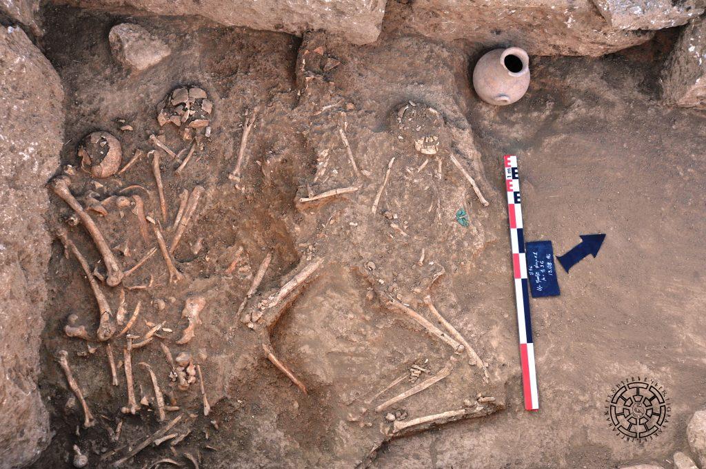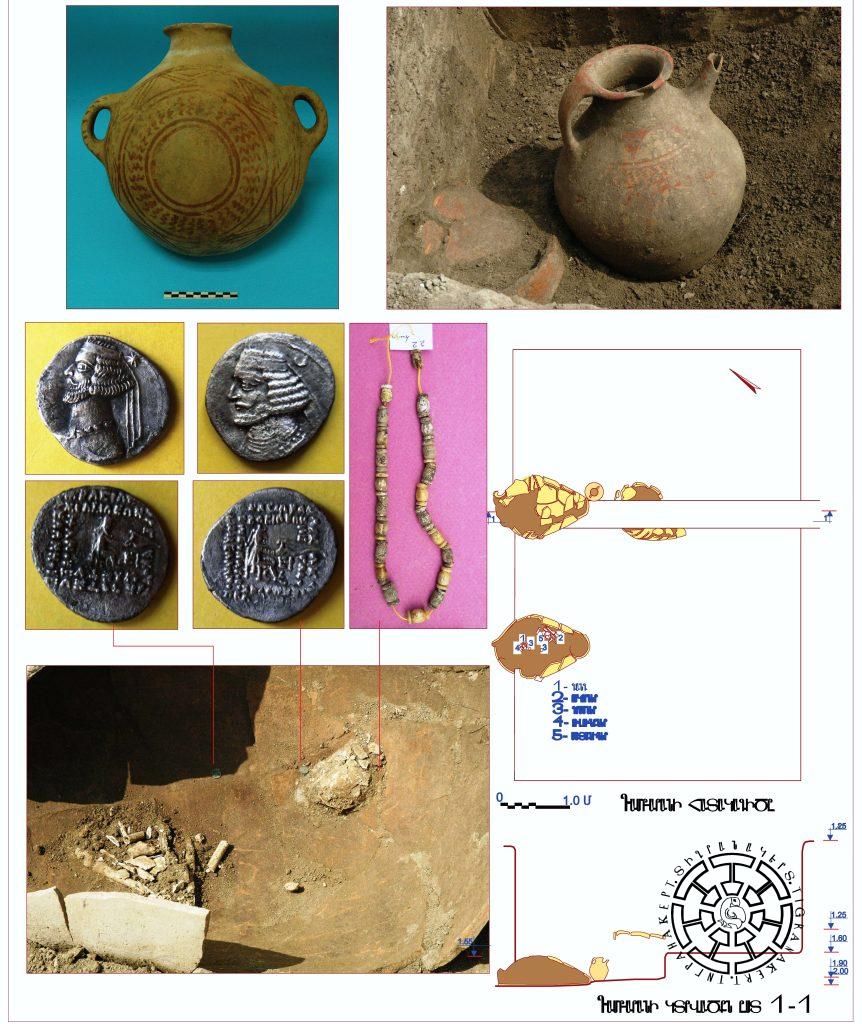Առաջին թաղումը բաղկացած էր հանգուցյալին ներառող կարասից և նրա հատակին դրսից հպված ծորակավոր անոթից (նկ. 2): Հայտնաբերվել են հանգուցյալի գանգի և կողոսկրերի և ձեռքի ոսկորների շատ վատ պահպանված մնացորդներ: Ատամների վրա և կողոսկրերի հատվածում գտնվել են երկու դրամներ: Դրամները շատ լավ պահպանված պարթևական արծաթյա դրախմաներ են (նկ. 1) և պատկանում են Պարթևական արքաներ Միհրդատ երրորդին (մ.թ.ա. 57-54 թթ.) ու Որոդ երկրորդին (մ.թ.ա. 57-38 թթ.): Գտածոների մեջ են ոսկյա ֆոլգայով պատված ուլունքները (նկ. 3) և ապակե գեմմաներով երկաթյա երեք մատանիները: Այս թաղման շրջակայքում պատահականորեն գտնվել է նաև գունազարդ տափաշիշ (նկ. 4):