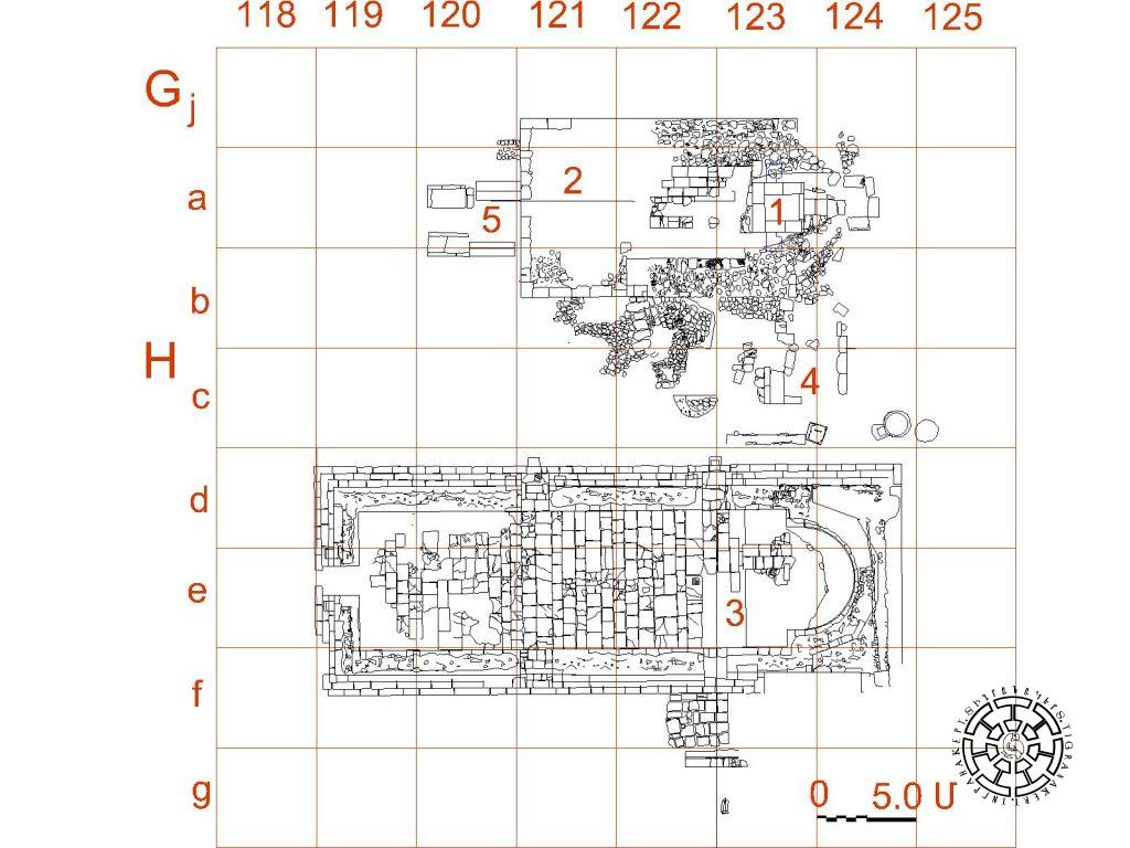 Եկեղեցու վերը նշած ճարտարապետական առանձնահատկություններին կարելի է հավելել և հյուսիսային երկու մուտքերի առկայությունը: Եթե արևմտյան մուտքի առկայությունը միանգամայն օրինաչափ էր, և բնական էր թվում նաև հարավային զույգ մուտքերի առկայությունը, նկատի ունենալով եկեղեցու չափերը և հարավից կից կառույցների առկայությունը, ապա արտառոց էր հյուսիսային զույգ մուտքերի առկայությունը: Վաղքրիստոնեական տաճարները որպես կանոն հյուսիսային մուտք չեն ունենում, միայն եզակի դեպքերում, երբ տեղանքի թելադրանքով անհնար էր արևմտյան կամ հարավային մուտքի բացումը՝ կարելի է հանդիպել հյուսիսային մուտքի: Այս հանգամանքը հիմք էր տալիս ենթադրել, որ եկեղեցուն հյուսիսից հարող բակում ինչ-որ կարևոր կառույց (կամ կառույցներ) է եղել, որն էլ պայմանավորել է դեպի հյուսիս զույգ մուտքերի բացումը: Ուստի եկեղեցու և նրան անմիջապես հարող հարավային բակի բացումից հետո որոշեցինք պեղումները շարունակել դեպի հյուսիս: Ակնկալիքները լիովին արդարացվեցին, քանի որ պեղումները երևան բերեցին ընդարձակ սալահատակ մի բակ՝ վաղքրիստոնեական խաչակիր կոթողի (հիմնախարիսխը, պատվանդանը, սյան ու թևավոր խաչի բեկորները), արտաքուստ ընդգծված աբսիդով սրահի (փոքր եկեղեցի), նրան արևմուտքից կից տապանաբակի, և արևելյան աբսիդի տակ գտնվող դամբարանի մնացորդներով հանդերձ (նկ. 8):