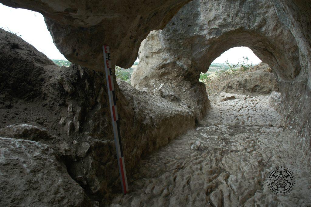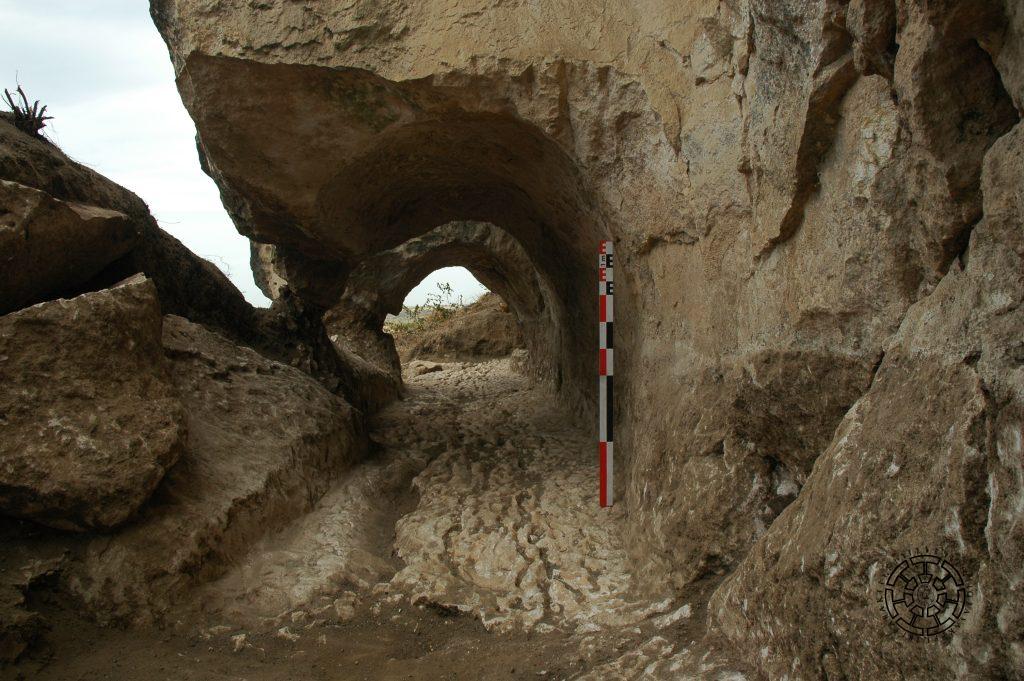 The second section of the tunnel was explored by the 2020 excavations. It includes one large and two small tunnels dug into the rock, forming its continuation, the total length of which is 10.5 meters (Figs. 11, 12). As a result of the excavations, the presence of the outer rock-carved wall of the canal was confirmed once again. Here, the canal has a width of 1.5 meters in its narrowest part and 2 meters in its widest part. The height of the rock tunnel was 0.8 meters. The rocky bottom of the canal was covered with a 20-30 cm-thick sand sediment layer.