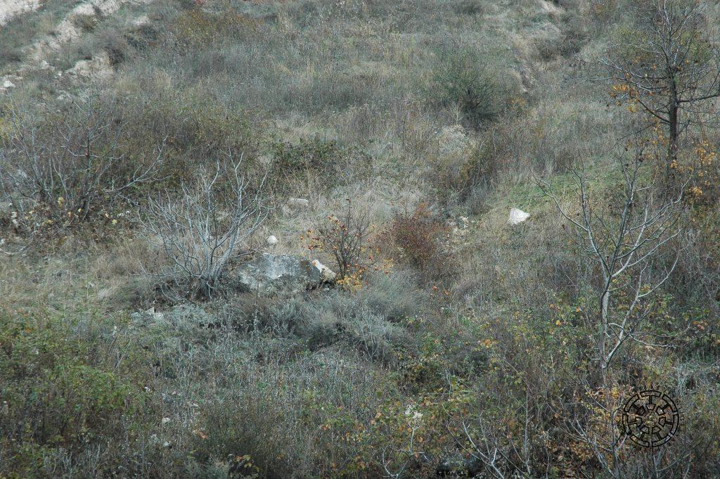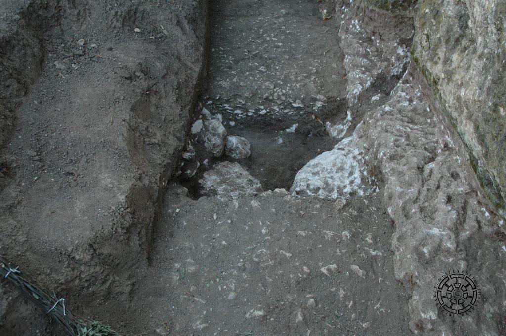 The archeological survey of the canal was carried out in 2006 and 2020. As a result, the entire trajectory of the canal was outlined. The approximate location of the start point from Khachenaget was determined, shedding light on its origin. A 300-meter section of the rock-cut part of the canal was excavated, and the technical structure of the main watercourse was clarified. Research on the rock-carved sections, including traceological analysis, was carried out. Signs carved on the walls were validated, photographed, and measured. The walls of the open sections of the canal were made with stone and mortar. Among them, sections with a height of 0.3-0.5 meters are preserved (Fig. 8). The width of the watercourse itself varies in different places, ranging from 1 meter in open areas to 1.5-2.0 meters in tunnel sections. In the open area, the floor was reinforced with a pressed layer of flat limestone burrs (Fig. 9) to reduce water loss on the soil base. At the same time, rock-carved sections and soil-based sections were often combined.
