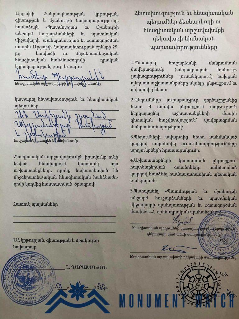 We would like to remind the semi-literate propagandists of the aggressive state that the archeological excavations in Tigranakert were carried out at the official invitation and with the permission of the Artsakh authorities, that every year the archeological commission within the Artsakh government issued a special permit, so called an open list, to the leader of the expedition (see photos of some of those permits) that the excavations were financed from the Artsakh state budget. The Tigranakert Archaeological Museum was established, operated by the decision of the legitimate authorities of Artsakh, with funding of the government of Artsakh. The archeological research of Tigranakert was carried out on a full legal basis, with high professionalism, the results of the research were regularly presented to the international scientific community. It’s just ridiculous to talk about a secret process.