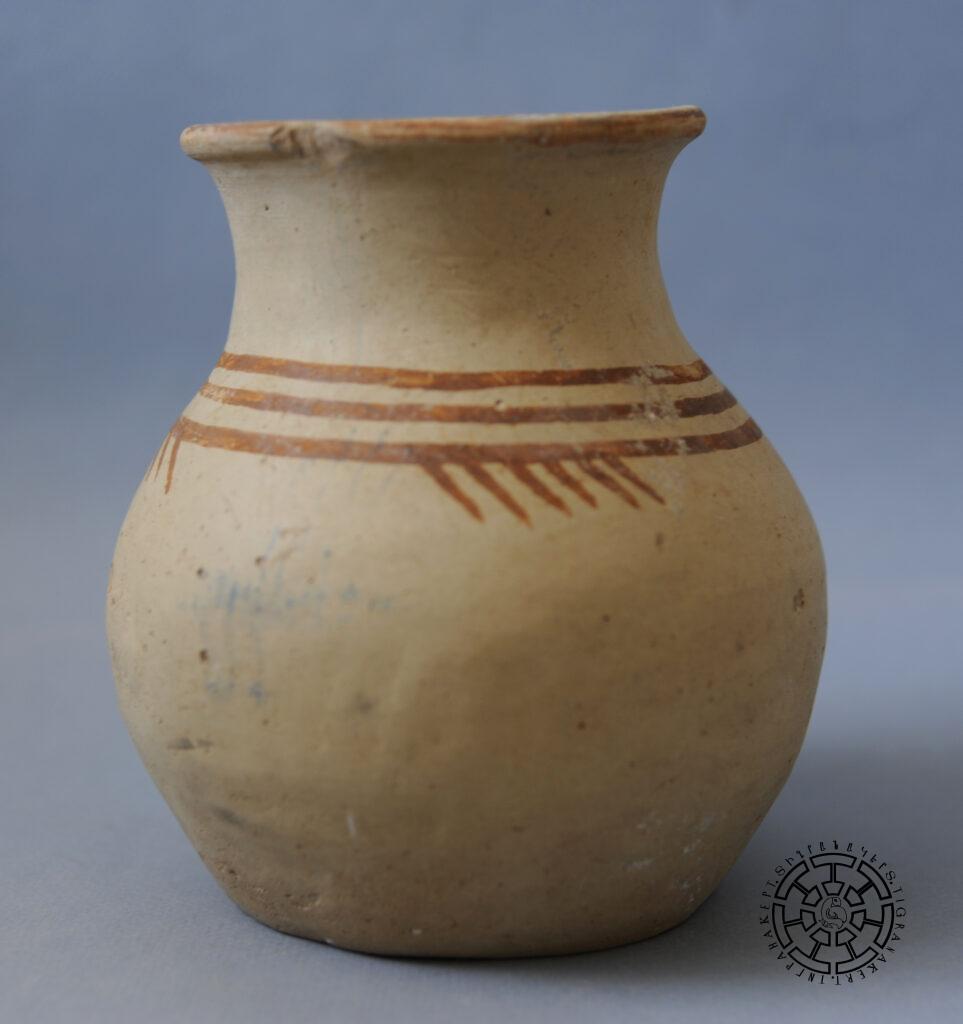 Кувшины составляют большую группу среди столовой посуды. У них плоский поддон, шаровидное в нижней части и выпуклое в верхней части тулово, длинное горлышко, высокий венчик. Кувшины изготовлены из хорошо замешанной мелкозернистой глины, которая от обжига приобрела светло-желто-коричневый цвет. Внешняя поверхность хорошо заглажена, отполирована и, как правило, расписана. Отдельную группу составляют сосуды с выпуклым туловом, коротким горлышком, венчиком в виде трилистника, дуговидной ручкой, один конец которой прикреплен к венчику, а другой – к плечику.